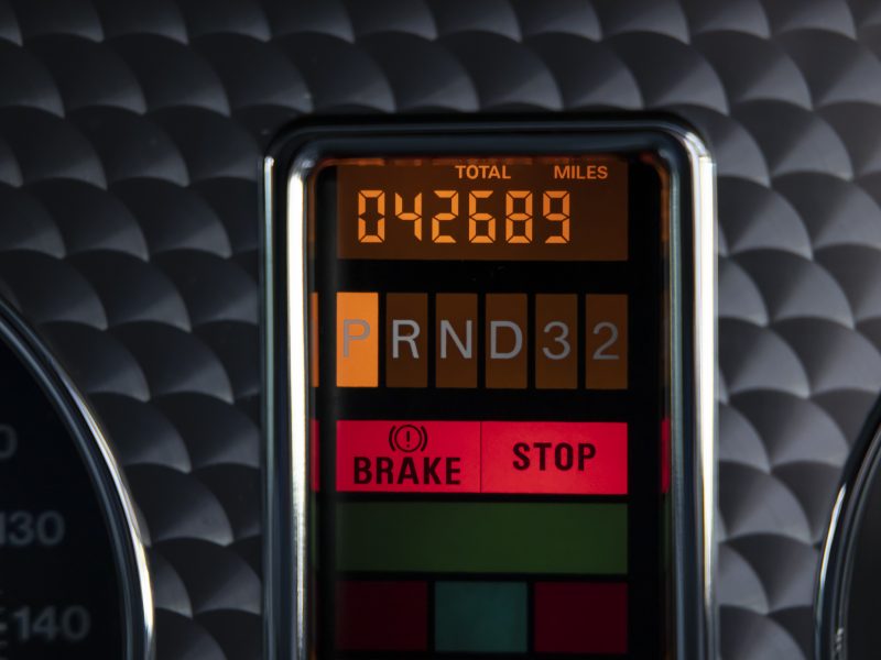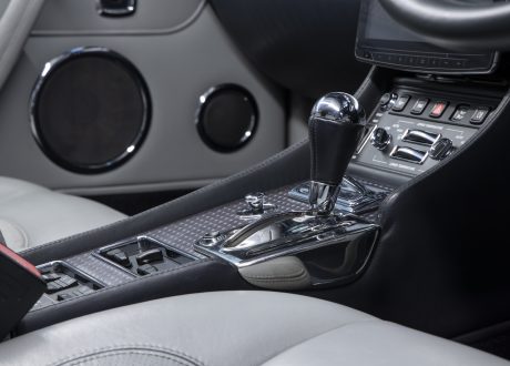 The customer specified interior trim’s main leather work including the roof lining is in Stratos hide, with the Steering Wheel, Gear Knob and carpet binding in Graphite hide. All seating has been luxuriously specified with ruched leather inserts. Wilton carpeting. Interior door trims are in Graphite hide with turned aluminium inserts. The centre dash fascia in Graphite hide highlight the familiar chrome “eyeball” vents and the centre console in turned aluminium showcases the craftsmanship of the Mulliner Park Ward coachbuilding team.